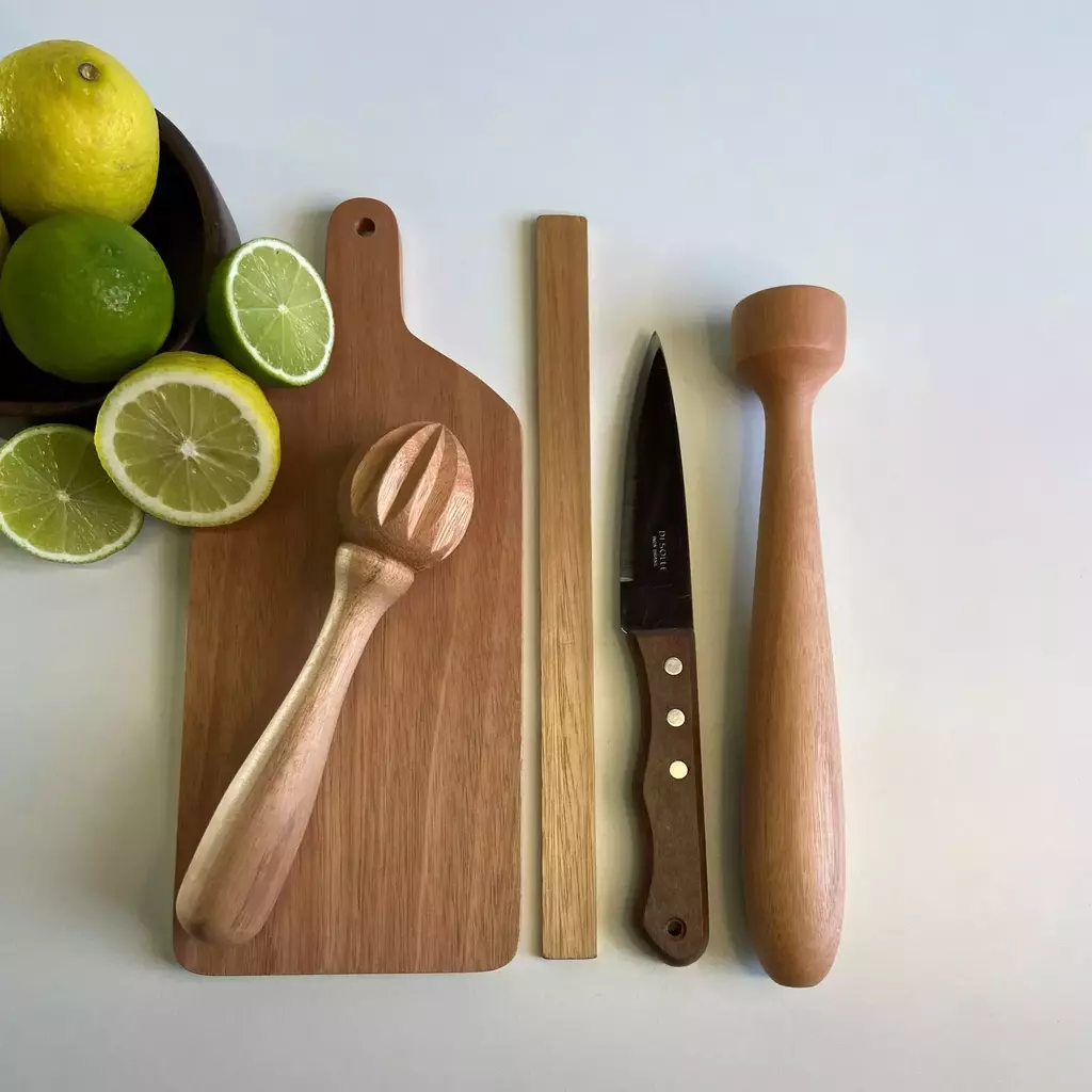 Este kit reúne os utensílios essenciais para quem aprecia preparar drinks de forma artesanal, unindo funcionalidade, tradição e design rústico em madeira natural.